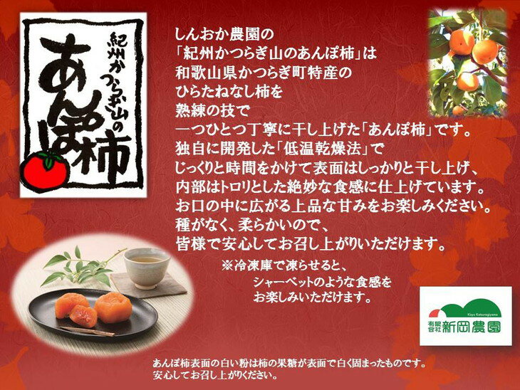 「紀州かつらぎ山のあんぽ柿」は 和歌山県かつらぎ町特産の ひらたねなし柿を熟練の技で 一つひとつ丁寧に干し上げた「あんぽ柿」です。